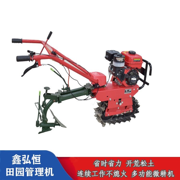 微耕机的结构包括机架、可调高低扶手,机架上设有的柴油机或汽油机、以及驱动轮和耕作刀具。微耕机可爬坡、越埂、阶梯性强,适用于平原、山区、丘陵的旱地、果园、菜地、烟地的深旋耕、浅旋耕、犁耕、开沟筑垄。配上相应机具可进行抽水、喷药、喷淋、起垄、复土、培土、开深沟、施底肥、除草碎土、偏培土、埋葡萄藤等作业,还可牵引拖挂车进行短途运输,微耕机可以在田间自由行使,便于用户使用和存放,省去了大型农用机械无法进入山区田块的烦恼,是广大农民消费者替代牛耕的选择,是大中型农机无法媲美的多功能微耕机,是进入农民家庭*理想的小型农机,深受广大用户的喜爱。